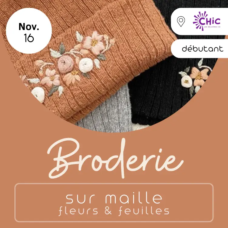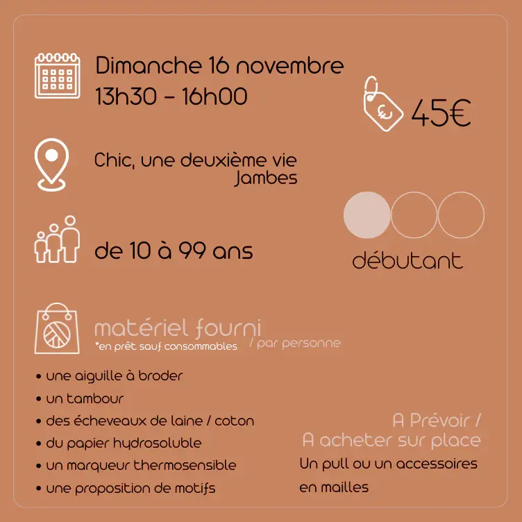 Un moment créatif, accessible à tous les niveaux, où tu repartiras avec des bases solides et l’envie de broder tes mailles encore et encore.